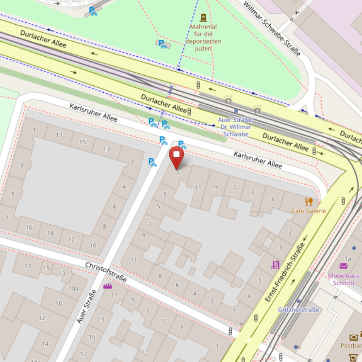 Von der Haltestelle aus sind es ca. 2 Gehminuten in die Karlsruher Allee und danach wenden Sie sich links bis zum Eckhaus, Auer Straße 1.